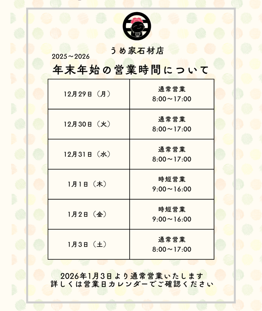2025年12月31日 / 最終更新日時 : 2025年12月31日 umeya-sekizai 未分類 年末年始の営業について 年末年始は、1月4日まで毎日営業いたします。 営業時間については変更がございますのでご確認ください。 みなさまのお越しを心よりお待ち申し上げます。 FacebookCopy