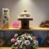 色とりどりのお花が飾られた小さな祭壇に亡くなられたご利用者様のスナップ写真が飾られています。