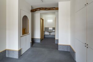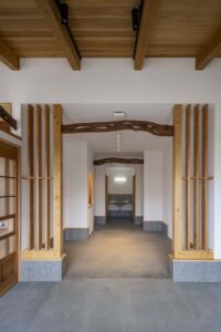 ガラス障子は吊り戸式に枠を作り替え、欄間はサイズ調整し、床柱は祭壇天井の梁に加工、写真にはありませんが祭壇の天井にかつての床の間の網代天井をリサイズして活用しています。
