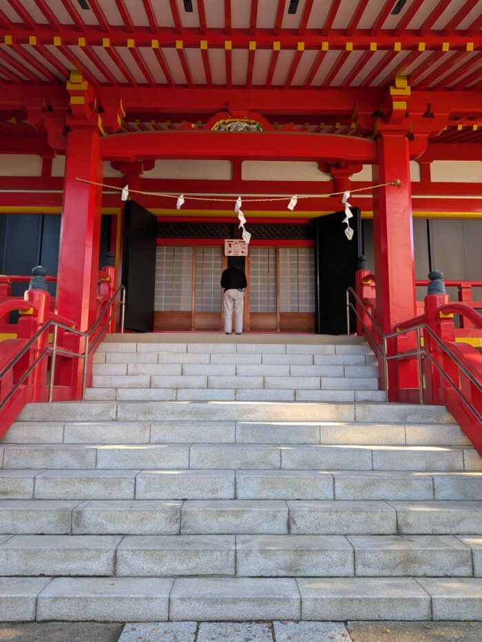 本堂内には入れませんでしたが、ガラス越しにお詣りできるようになっていました。朱塗りが鮮やかです。ご本尊は不動明王様でした。