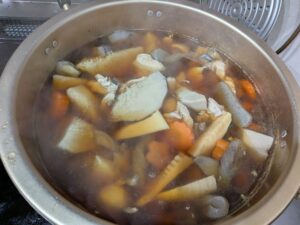 雑煮は鶏肉、ゴボウ、型抜きの残りのニンジン、大根、タケノコ、生シイタケ入りです。醤油ベースの関東風。