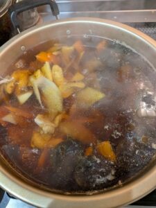 野菜はすべて 下ゆでしてから、煎り鳥(マーガリンで炒める)に合わせてたっぷりのだし汁で煮ます。生シイタケも水煮します。干しシイタケよりもさっぽりとした味になります。煮貝を煮汁ごといれ、タケノコ水煮、こんにゃく、銀杏、甘栗を入れて火が通れば出来上がり。