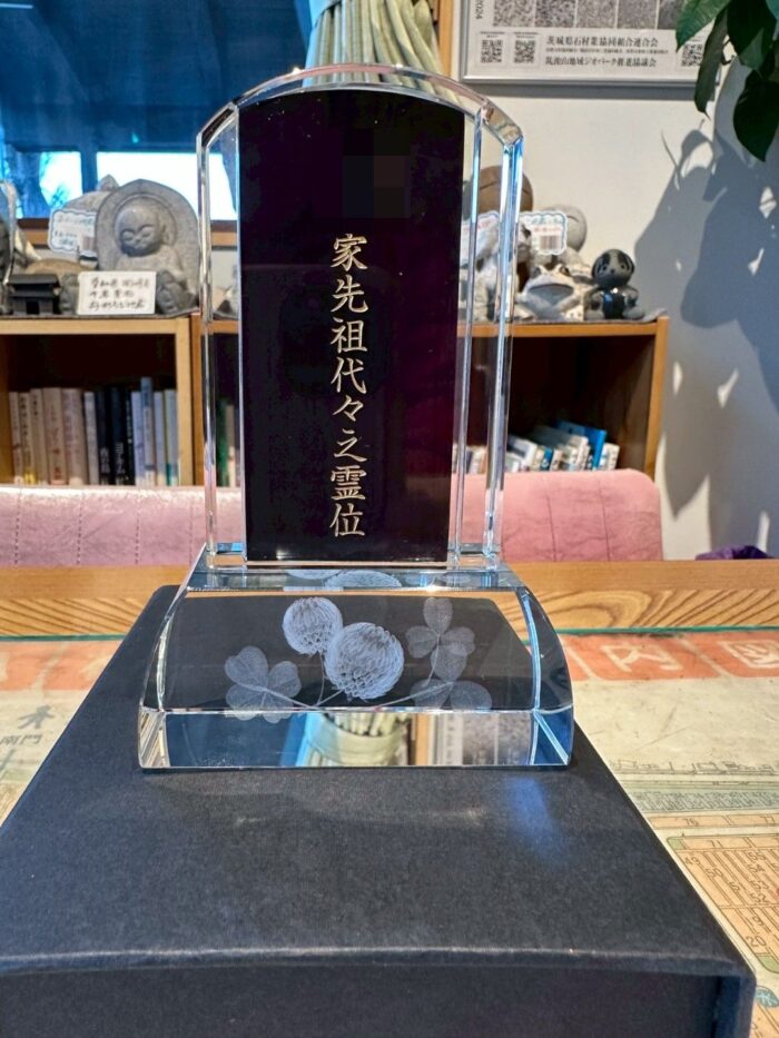 手を合わせる対象はお墓だけではありません。ご先祖様の依代である御位牌にも手を合わせます。御位牌も手配させていただいております。最近納品したクリスタル製の御位牌は洋風なお部屋にもピッタリです。