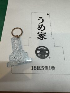 うめ家仕様で 家名・家紋・お墓番号を彫刻した お墓(和形)の形のキーホルダーです。