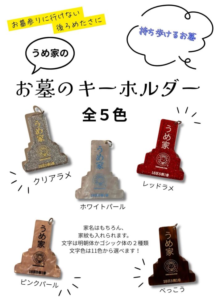 以前もお墓キーホルダーをご紹介しましたが、いよいよ5色出揃いました。