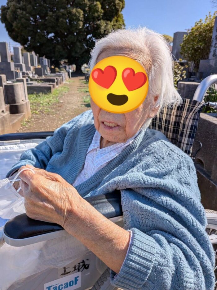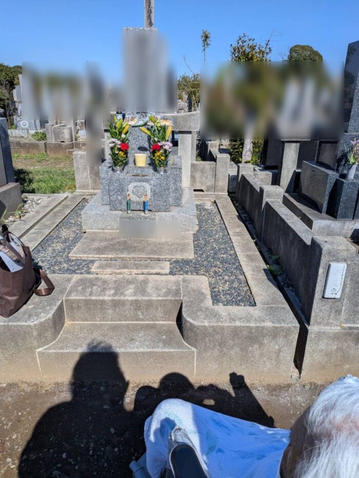約6年ぶりのお墓参りです。6年前は88歳、杖をつきながら自力歩行でしたが今では94歳になり車椅子でお参りです。